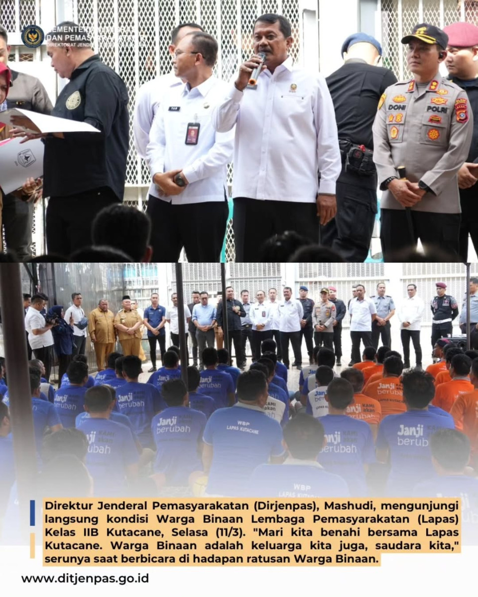 Direktur Jenderal Pemasyarakatan (Dirjenpas), Mashudi, mengunjungi langsung kondisi Warga Binaan Lembaga Pemasyarakatan (Lapas) Kelas IIB Kutacane, Selasa (11/3). “Mari kita benahi bersama Lapas Kutacane. Warga Binaan adalah keluarga kita juga, saudara kita,” serunya saat berbicara di hadapan ratusan Warga Binaan.